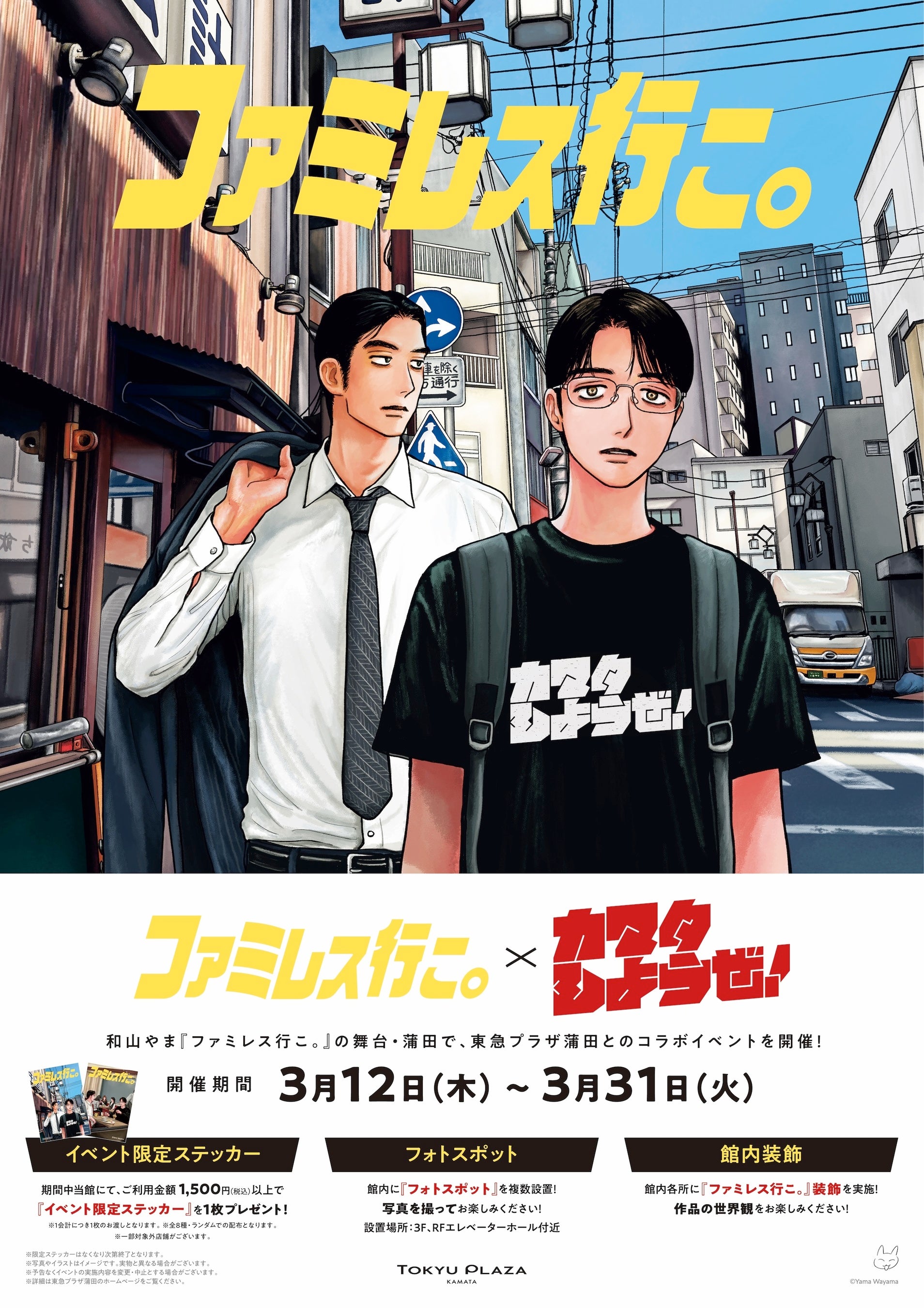 東急プラザ蒲田(以下、当館)では、“街や住民の皆様とさらに強い絆を結ぶこと”をテーマに、2025年に策定したスローガン「カマタしようぜ!」の一環として、蒲田も舞台となっている漫画『ファミレス行こ。』とコラボレーションしたイベント「ファミレス行こ。×カマタしようぜ!」を、春休み期間の2026年3月12日(木)から31日(火)まで開催します。
