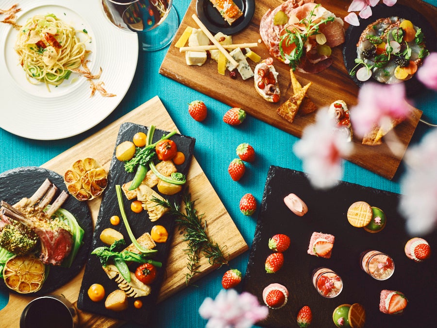 イタリアングリル「メロディア」で人気のディナーコース「Insiemeインシエメ」に「桜いちごアフタヌーンティー」セットのスイーツ5種がセットになった特別プランです。