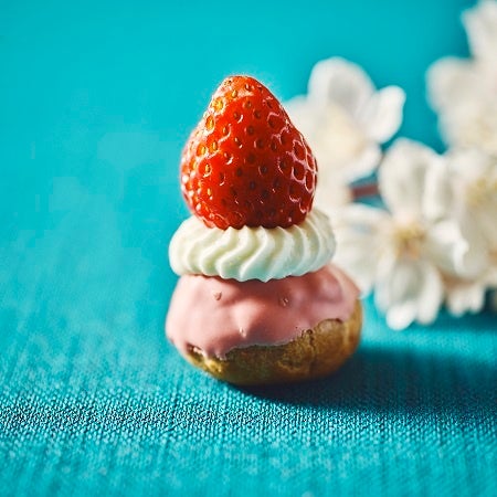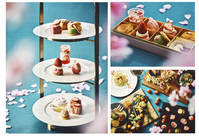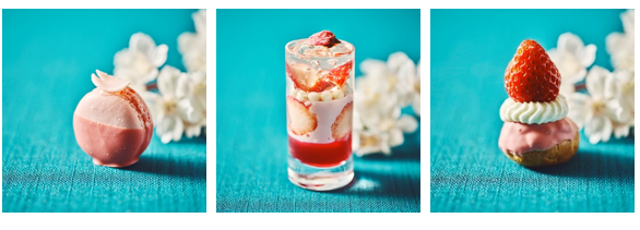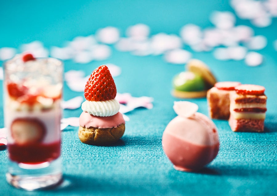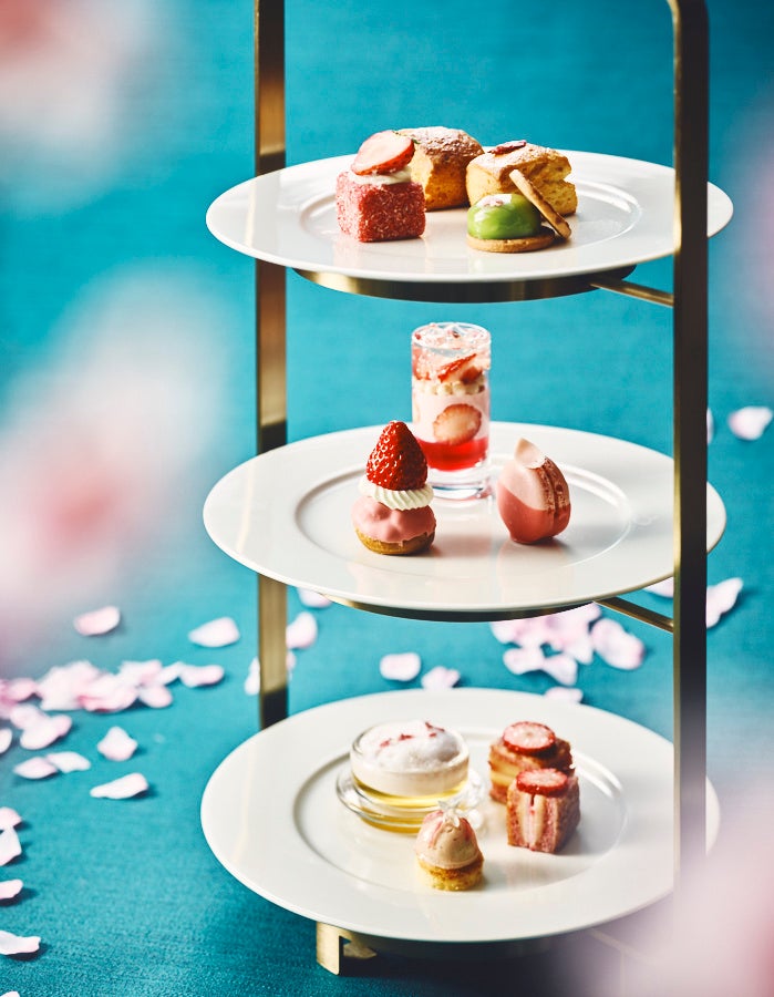 「桜いちごアフタヌーンティー」をテーマに考案したメニューには、抹茶の香りと塩漬けにした桜のアクセントが大人の味わいのガナッシュ、苺と桜のソースが香るふんわり食感のラミントン、ほのかに香る桜風味のクリームをサンドした、桜ピンク色のマカロン、見た目から、“修道女(シスター)”という意味のフランスの伝統菓子ルリジューズは、シュークリームにルビーチョコレートをコーティングして、フレッシュな苺と一緒にお召し上がりいただきます。グラスデザートには日本酒のジュレとフレッシュ苺のマリアージュ、サクサクしたパールクラッカン、くちどけなめらかな苺のパンナコッタ、木苺のコンポートがグラスの中で美しい層になったデザートと、どの角度から眺めても華やかな苺と桜のスイーツを集めました。セイボリーにもユニークなメニューが登場。桜のジュレをまとったフォアグラとブリオッシュのコクが絶妙なマッチングのオープンサンド、口いっぱいに桜の香りが広がる桜ヴィシソワーズ、苺の酸味がさわやかなクロックムッシュと、ここでしか体験できないオリジナリティ溢れる至福のセレクションです。天井高27mの吹抜けが圧巻のモダンラグジュアリーな空間にて、苺と桜が織りなす、春のアフタヌーンティーコレクションをご堪能ください。