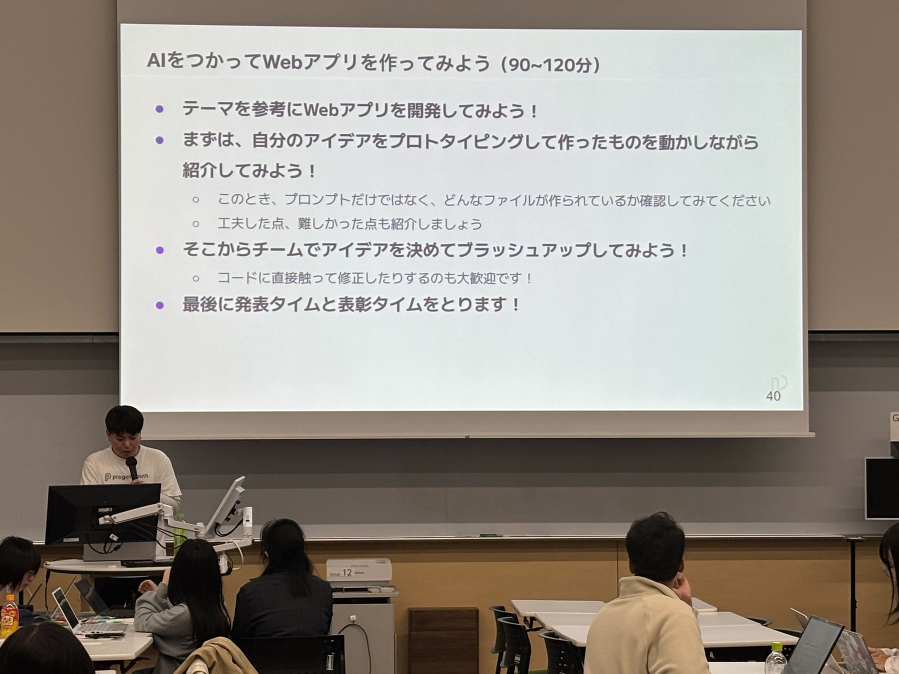 株式会社Progate(本社:東京都渋谷区、代表取締役:加藤 將倫、以下「Progate」) は、2025年3月10日(月)、立命館アジア太平洋大学(大分県別府市、学長:米山裕、以下「APU」) と 九州工業大学(福岡県北九州市、学長:三谷康範、以下「九州工業大学」) が共同で開催したAI活用型ミニハッカソン「生成AIを使ってWebアプリケーションを作ろう」にて、講師・運営として指導を担当いたしました。