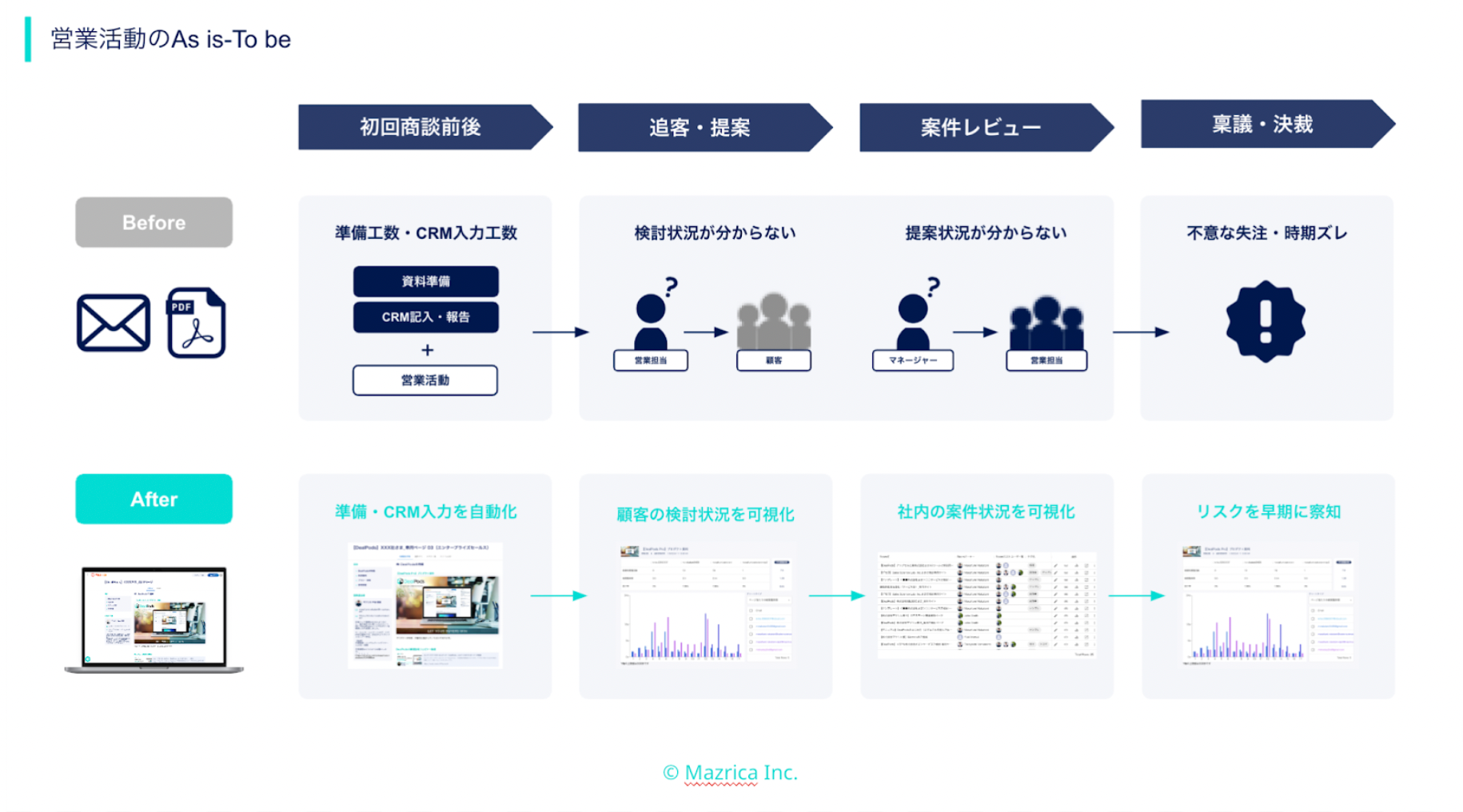 営業は、従来は分からなかった顧客と非接触時の関係者ごとの興味関心・動きをデータとして可視化することができるようになり、それらのデータをもとに顧客に合わせた営業活動を実施できるようになります。また、従来、営業活動を行なった後に、CRM/SFAに自身の活動の記録を入力する必要があったのですが、DealPodsを活用することで顧客に送った連絡、情報をワンクリックでCRM/SFAに記載できるようになり、CRM/SFAへの入力工数も驚くほどに下がります。
