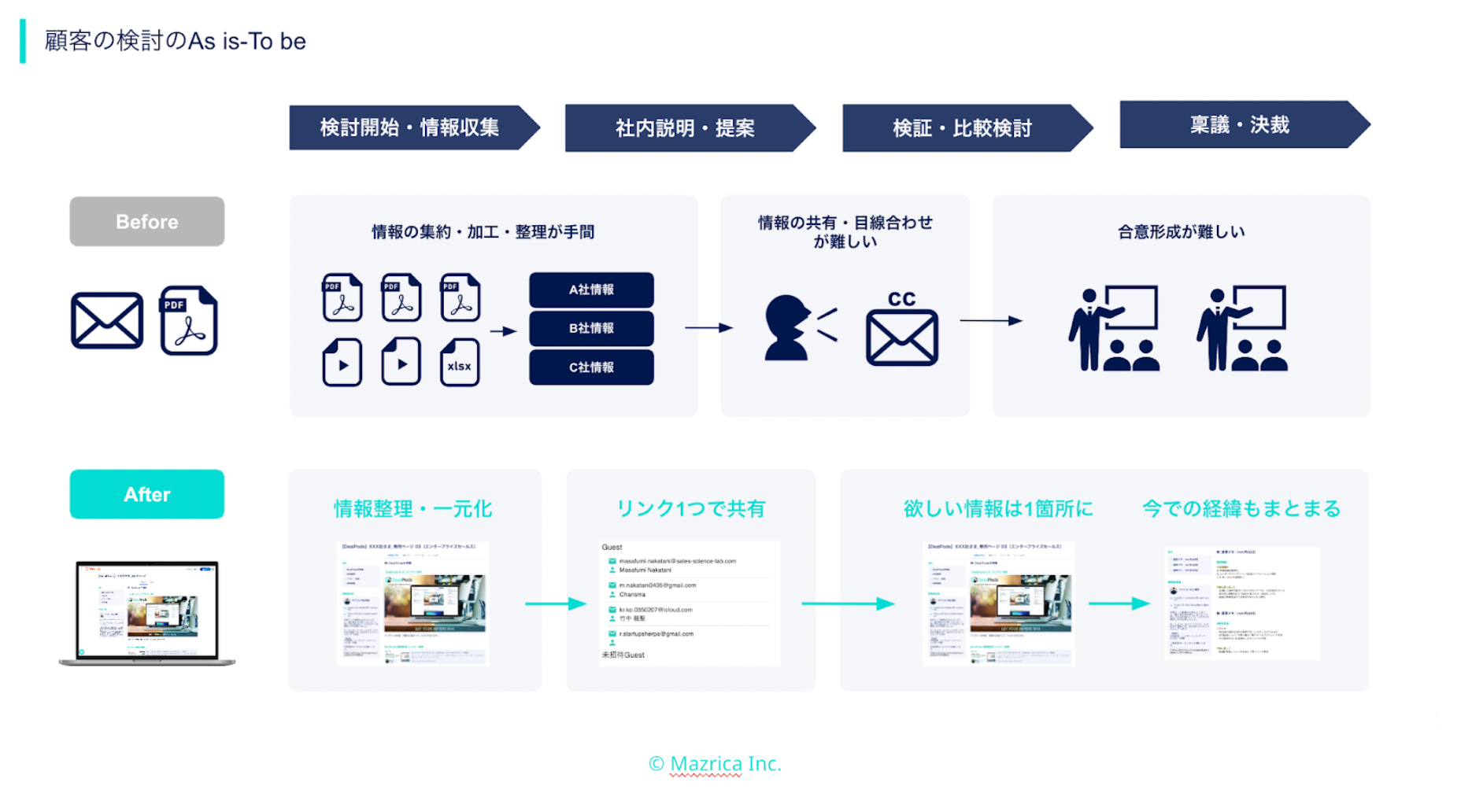 顧客は、従来の営業からメールでバラバラに資料などの情報を受け取ったり、社内共有用に情報をまとめたり、毎回、これまでの検討の経緯など同じ説明を社内で行う活動から解放されます。DealPodsを利用することで、営業が1枚のページにあらゆる情報を整理して提供してくれます。これにより、欲しい情報が1箇所に整理され、リンク1つで社内で簡単に情報共有が可能です。