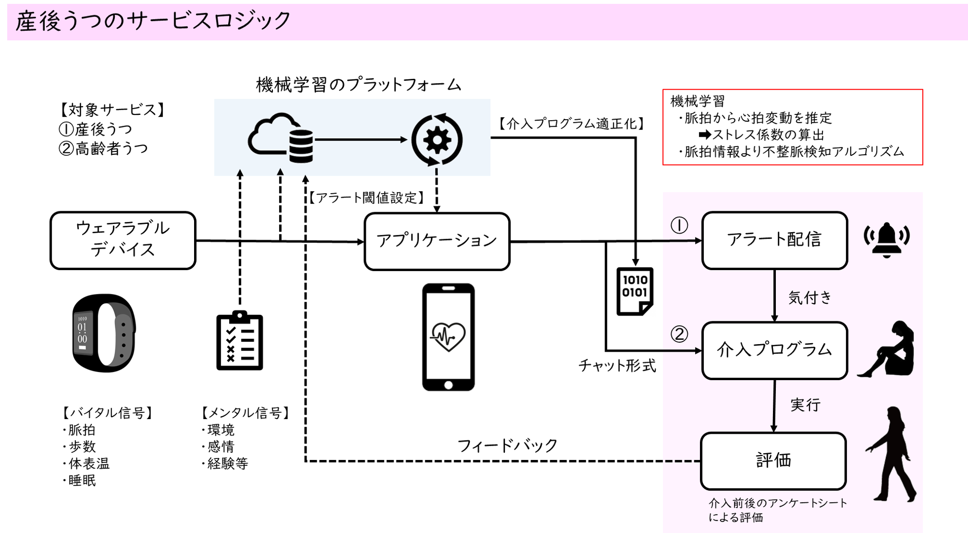 第二次開発ではソーシャルサービスは、うつ状態に対応する介入プログラムの提供を予定しております。(米国においてはWoebot Healthが、既にFDAの認証をとり、産後うつの治療として使用されています。)