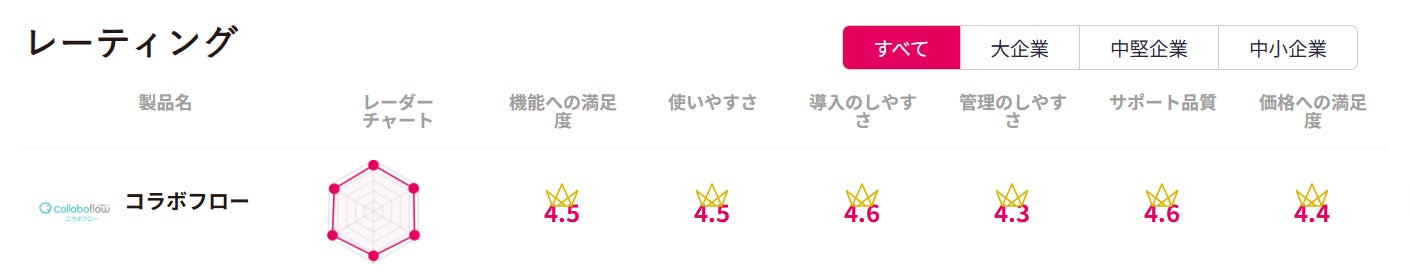 コラボフローは、ワークフローシステム部門の全28の評価項目のうち、満足度をはじめとする25項目でNo.1評価を獲得しました。