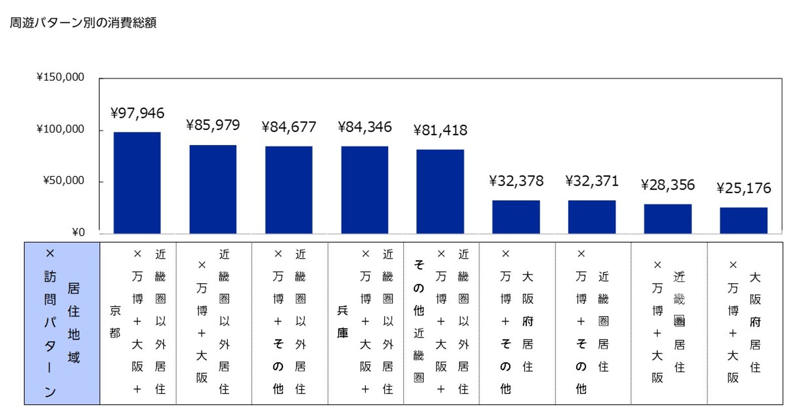 大阪・関西万博来場に伴う周遊先と消費総額について、居住地域と大阪・関西万博会場周辺地域への周遊実績の組み合わせを9パターンに分けて分析した。その結果、「居住地域が近畿圏以外×万博+大阪+京都」(97,946円)が最も高く、次いで「居住地域が近畿圏以外×万博+大阪」(85,979円)、「居住地域が近畿圏以外×万博+その他」(84,677円)が続いた。遠方からの来場者が大阪・関西万博訪問に加えて複数地域を周遊するパターン、特に京都との組み合わせが、消費総額を大きく押し上げる傾向があったことを示している。