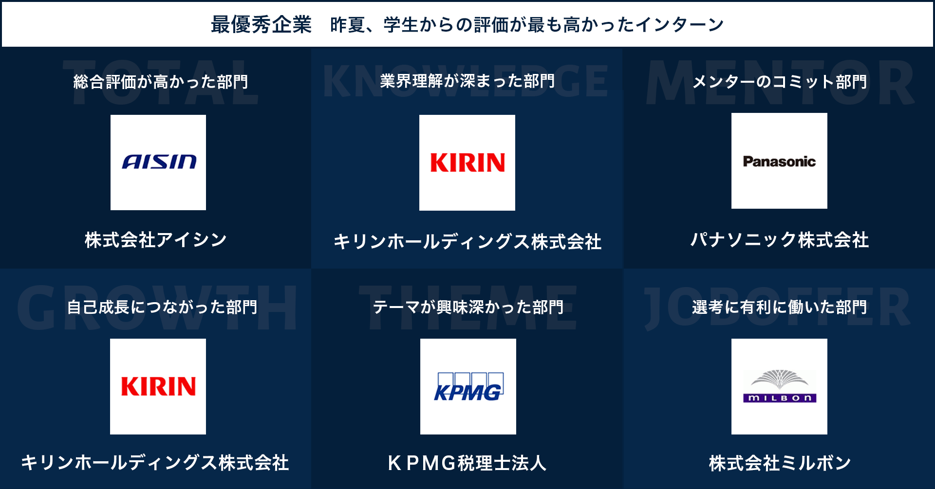 株式会社アイシン、キリンホールディングス株式会社、パナソニック株式会社、KPMG税理士法人、株式会社ミルボンが上位にランクイン