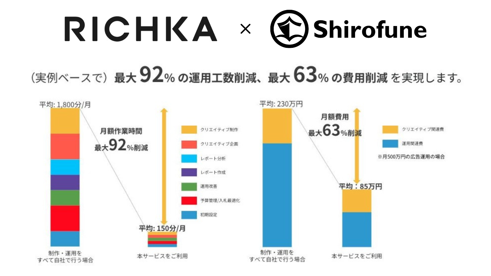 リチカとShirofuneの業務提携により、経験が浅い担当者でも一定のレベルのクリエイティブ制作と広告の運用が可能となり、レポート機能で広告ごとの成果を可視化、改善まで行うことが可能になります。