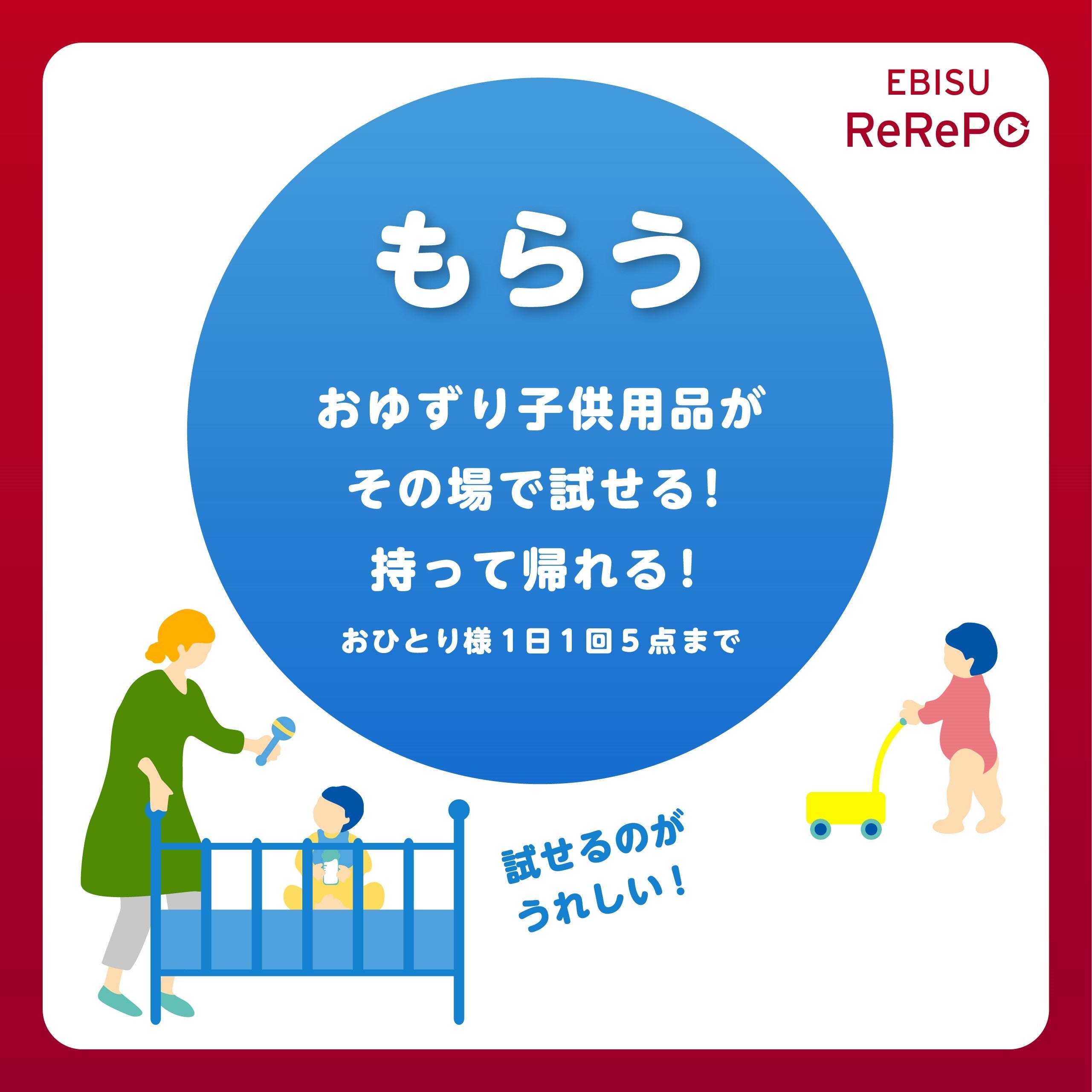 ※1: 「ゆずる」とは、ご家庭でご不要になった子供用品(破損や汚れがなければどのようなものでも可)を会場にお持ちいただくだけで、それを必要としている「まち」の誰かに手軽におゆずりできるサービスです。