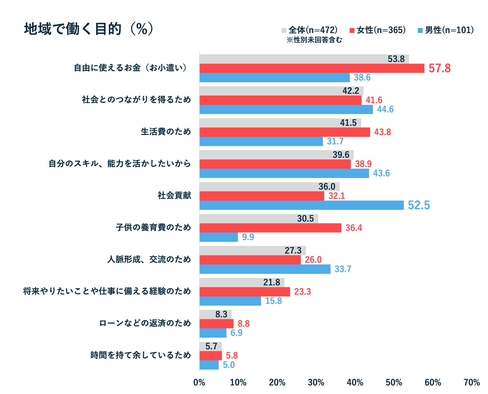 一方、男性に注目すると「社会貢献」が最多(52.5%)で、次に「社会とのつながりを得るため」(44.6%)となりました。仕事を通じて地域との接点を求める男性が多いことがわかりました。
