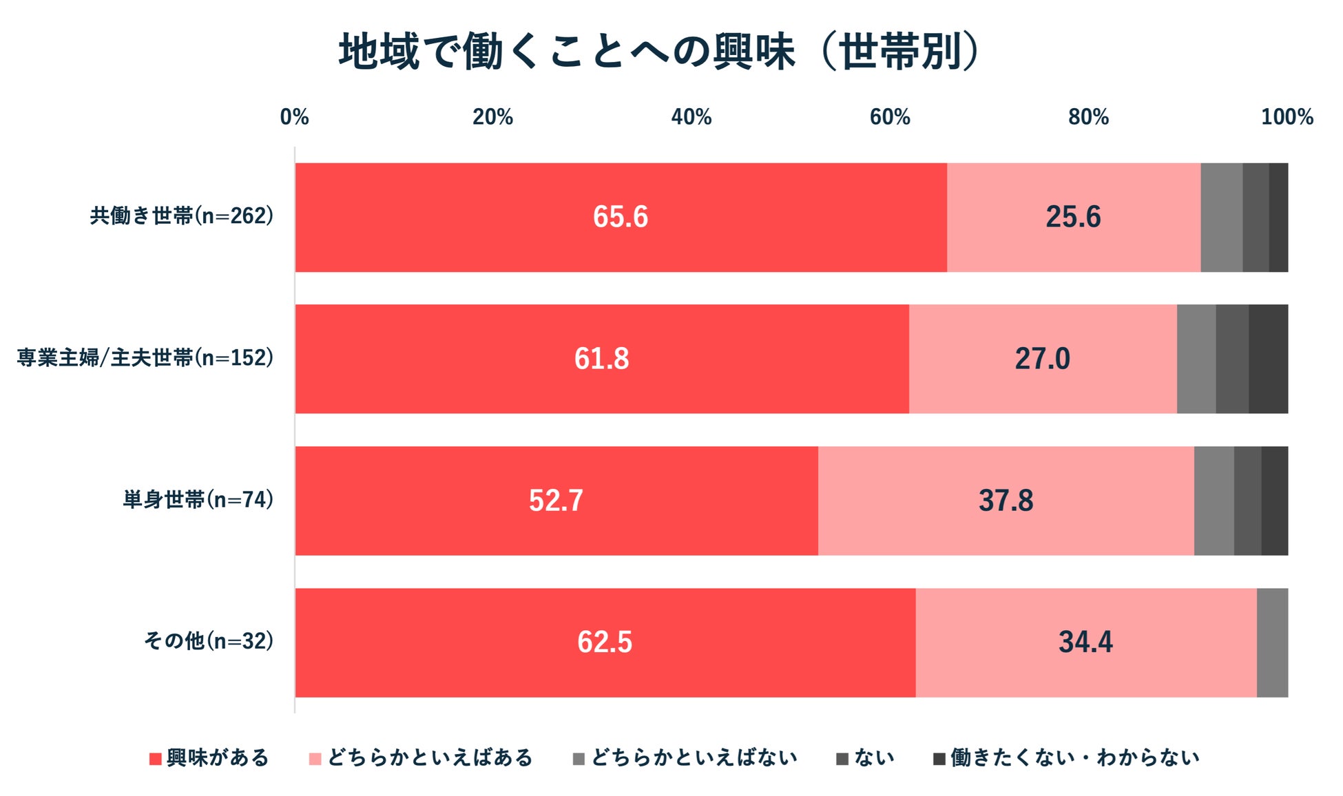 また世帯別でみると、専業主婦(主夫)世帯や単身世帯よりも、共働き世帯の方が地域で働く意欲が特に高い結果となり(91.3%)、副業として地域で働くことへの興味関心が高まっていることが伺えます。