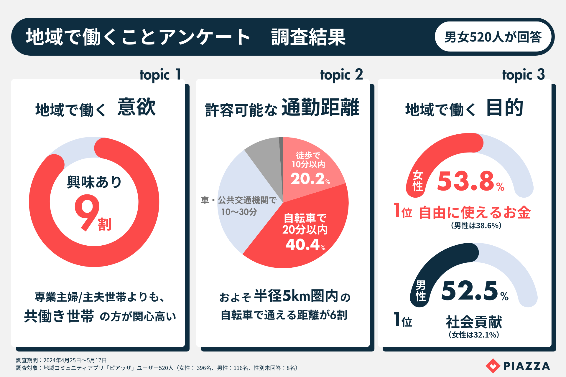 地域コミュニティアプリ「ピアッザ」を運営するPIAZZA株式会社(代表取締役 CEO:矢野 晃平、以下 PIAZZA)は、スキマ時間に短時間だけ働くスポットワークのニーズの高まりを受けて、「ピアッザ」のユーザー男女520名を対象に「地域で働くことアンケート」調査を実施しました。