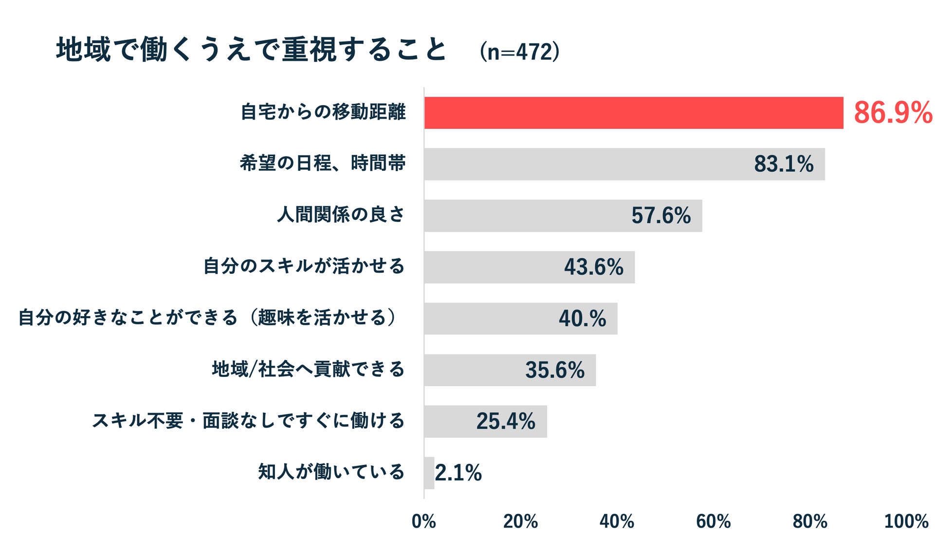地域でスキマ時間に働く際に重視することを尋ねたところ、約9割の人が「自宅からの移動距離」を重視していることが判明しました(86.7%)。次いで「希望の日程、時間帯(83.1%)」が続いており、仕事内容よりも生活との両立がしやすいかどうかが重要であることが伺えます。