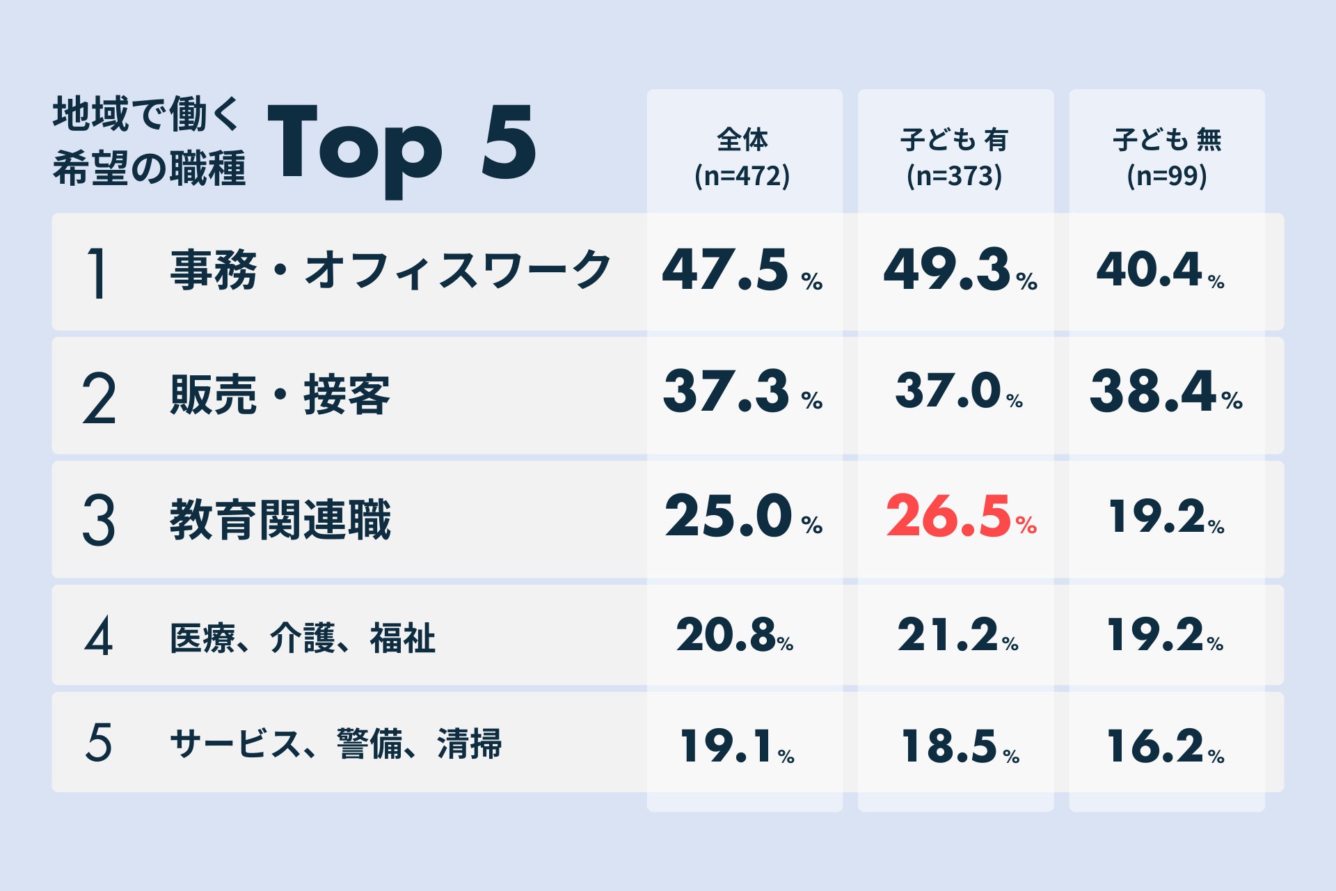 地域で働く際の希望の職種を尋ねたところ、1位「事務・オフィスワーク」(47.5%)、2位「販売・接客」(37.3%)に続いて、3位は「教育関連職」(25.0%)となりました。