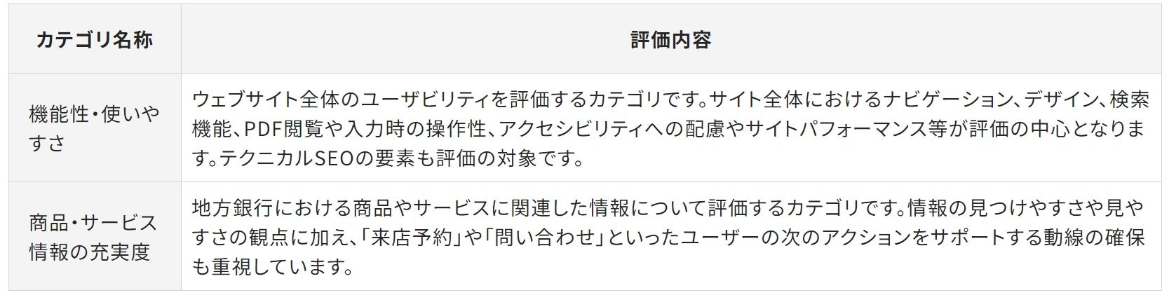 当ランキングでは、「機能性・使いやすさ」と「商品・サービス情報の充実度」の2つのカテゴリから構成する220の調査項目によりGomezのアナリストが評価し、総合的に優れた地方銀行サイトのランキングを決定します。