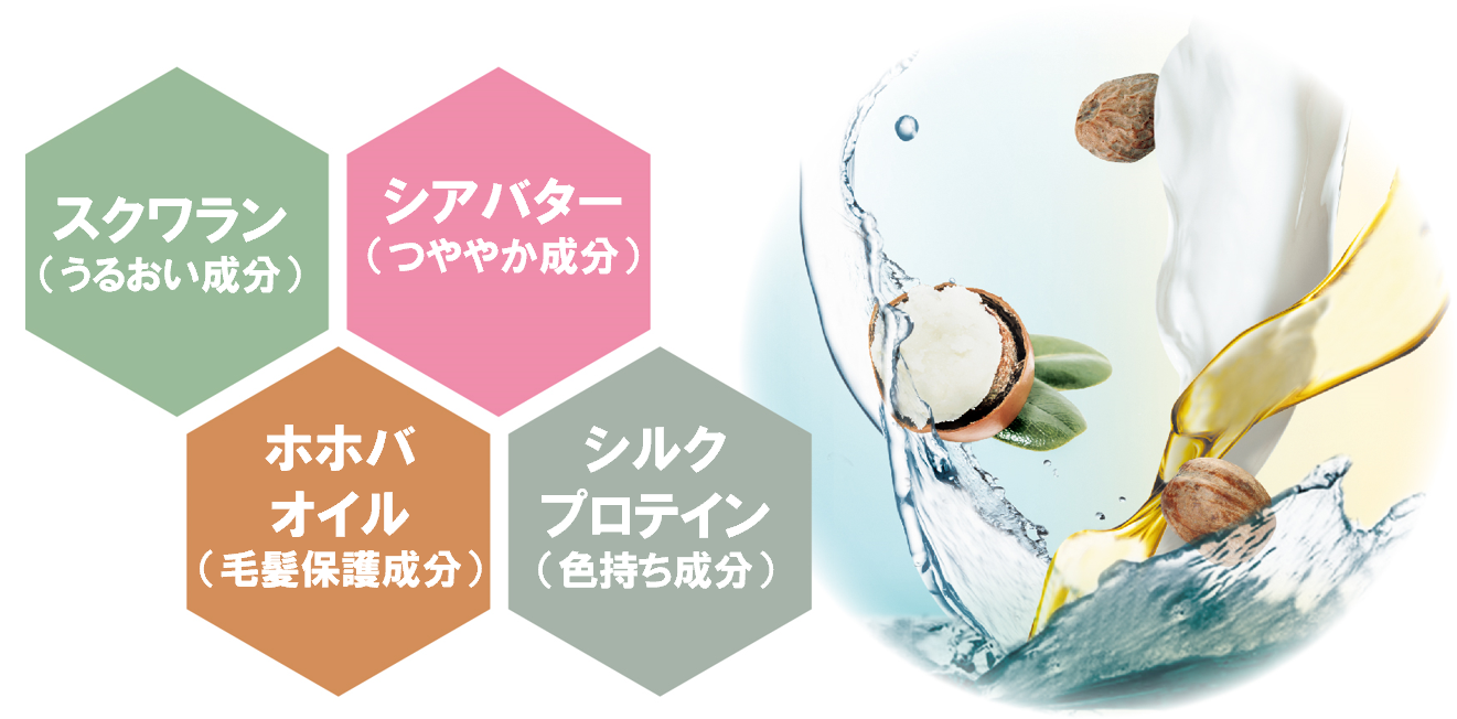 白髪と黒髪のなじみ具合をUP(※)させた浸透ディープカラー処方で、黒髪は明るく、白髪は鮮やかにバランス良く染め上げるのがポイントです。すっと伸びて髪全体になじみやすい乳液タイプで、たっぷり使えるので染め残しなくキレイに仕上がります。ツヤとうるおいのある髪色が続く4つのトリートメント成分を配合。さらに、ヘアカラー前後に使うWトリートメントが傷んだ髪を補修します。髪や頭皮を大切にしながら、白髪があっても髪色を楽しみたい方におすすめです。