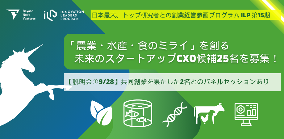 INNOVATION LEADERS PROGRAM(ILP)は、起業家・経営者を目指すビジネスパーソンが、先端技術の事業化を目指す国内有数の研究者とスタートアップの創業に挑むプログラム。本業を続けながら参加可能。公式ページ:https://beyondnextventures.com/jp/startupcareers/ilp/