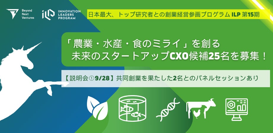 ILP15期では、研究者と共に食・農・水産領域のディープテックの事業化に挑むビジネスパーソン【未来のCXO25名】を募集します。スタートアップの創業・経営メンバーとして、仕事の傍ら100日間バーチャル参画いただき、「創業初期の事業プランづくり・資金調達」をはじめ、リアルな経営課題に真剣勝負で取り組んでいただきます。少しでも興味がある方はオンライン説明会にご参加ください。