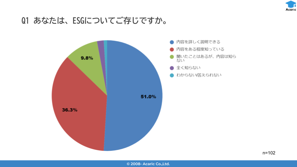 - 回答者の8割以上がESGの内容を知っており、半数以上はESGについて説明できる