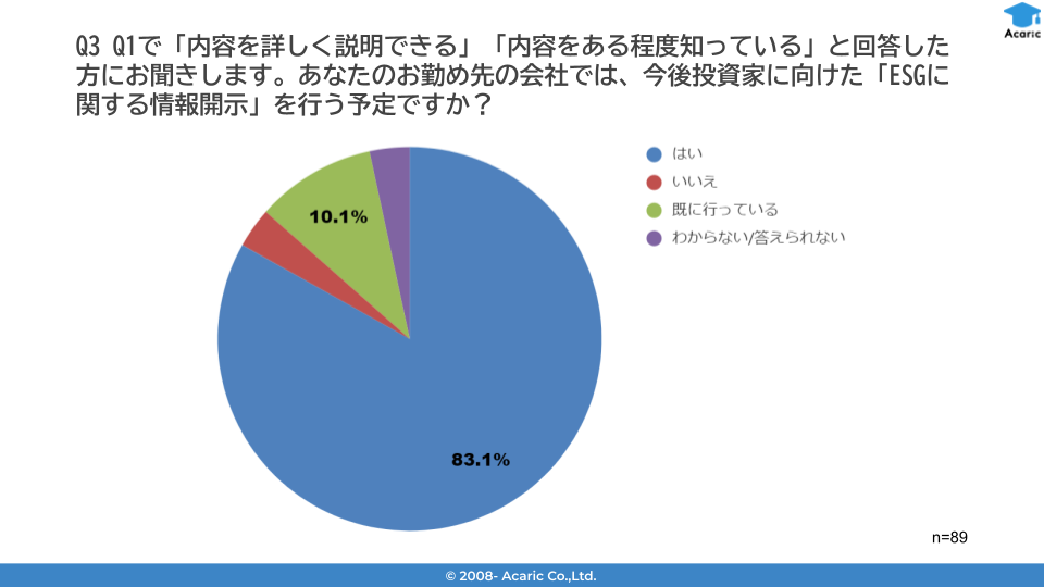 - 1.ESGの内容を知っている方の8割以上が投資家に向けたESGに関する情報開示を実施予定