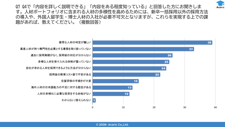 「Q7 Q4で「内容を詳しく説明できる」「内容をある程度知っている」と回答した方にお聞きします。人材ポートフォリオに含まれる人材の多様性を高めるためには、新卒一括採用以外の採用方法の導入や、外国人留学生・博士人材の入社が必要不可欠となりますが、これらを実現する上での課題があれば、教えてください。(複数回答)」