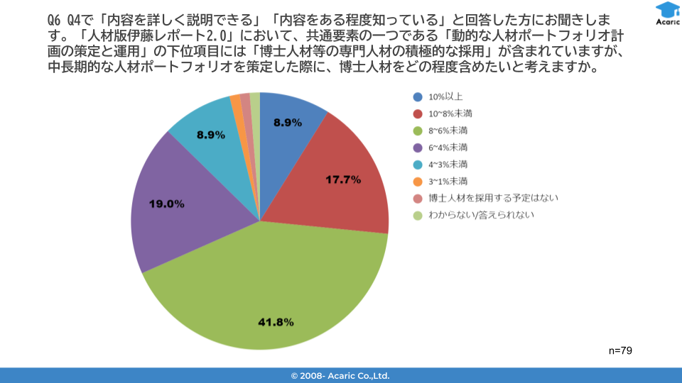 - 社内には「8~6%」の博士人材を在籍させたいとの意向、博士人材の採用予定なしは1%程度