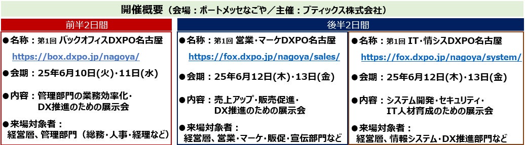 本展の主催者であるブティックス株式会社は、本分野日本最大級の商談型展⽰会、バックオフィスDXPO/営業・マーケDXPO/店舗・EC DXPOを全国3会場(東京・大阪・福岡)およびオンラインで、毎年ハイブリッド開催しており、本展の開催によって、2025年のDXPOは、全国4会場(東京・大阪・福岡・名古屋)の定期開催となる。