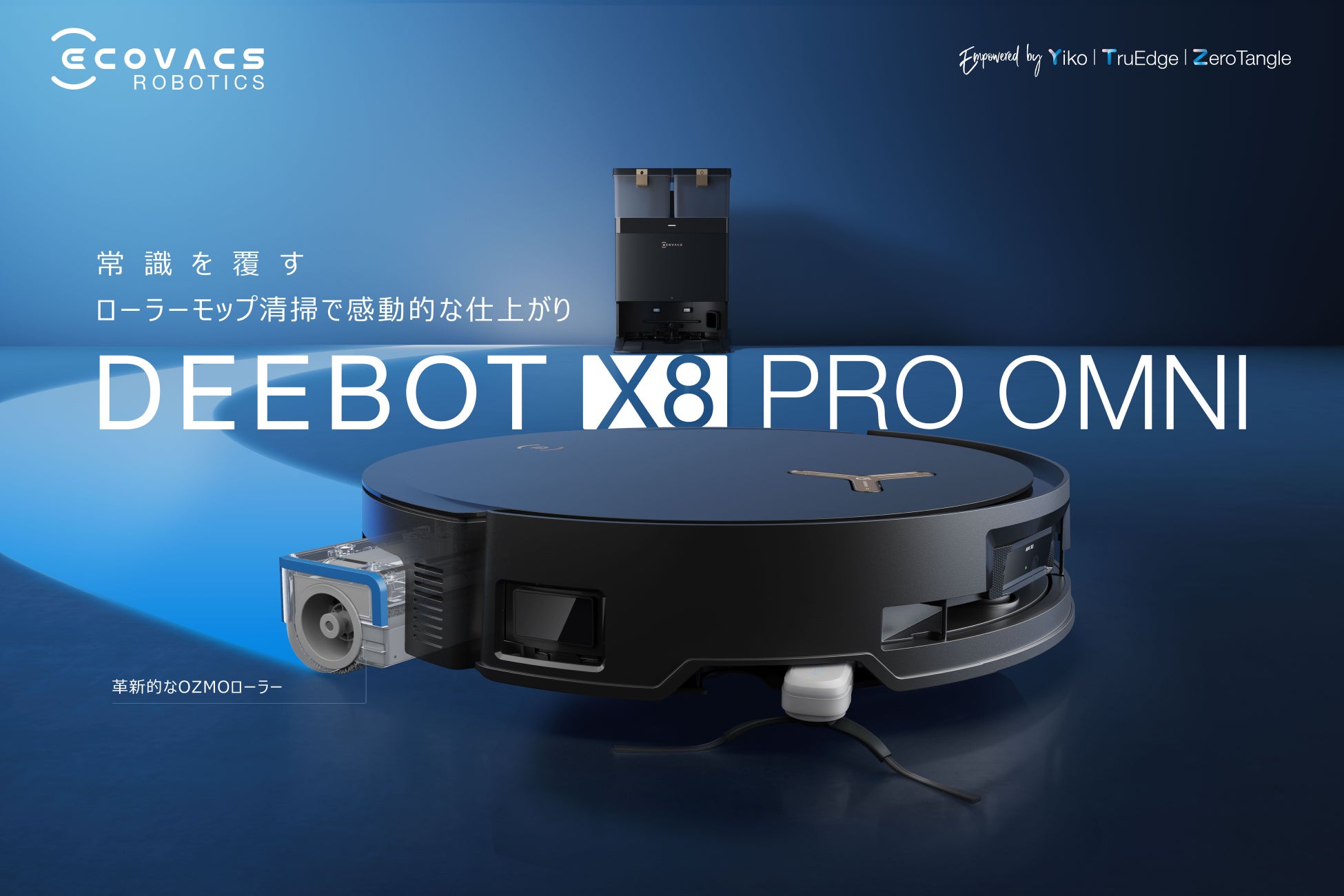 DEEBOT X8 PRO OMNI:革新的なOZMOローラーモッピングで、床掃除の概念を変えるエコバックスのフラッグシップモデル。最新のAI技術を搭載し、強力な吸引力と水拭き機能で、床を隅々までクリーニングします。