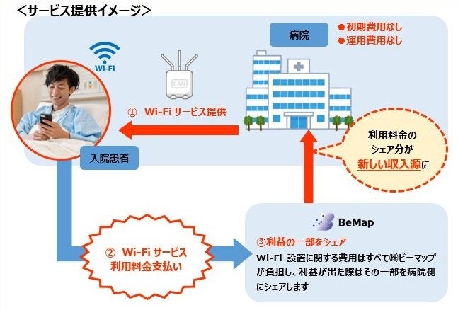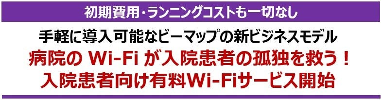 株式会社ビーマップ(本社:千代田区、代表取締役社長:杉野 文則、以下当社)は、このような課題に対応した入院患者向けの有料モデルのWi-Fiサービスを11月1日より開始いたします。