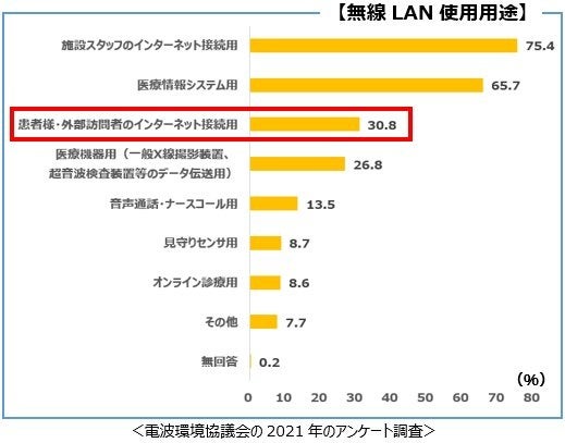 電波環境協議会の2021年のアンケート調査によると、病院及び有床診療所の民間データベースに掲載されている施設の、88.7%が無線LANを導入しています。主な使用用途は「施設スタッフのインターネット接続用」(75.4%)、「医療情報システム用」(65.7%)が上位である一方、「患者・外部訪問者のインターネット接続用」は30.8%に留まっています。入院患者はインターネットで家族や友人とコミュニケーションを取ったり、自身の病気や治療の情報収集、その他情報検索などを望む声も少なくありません。かつては病院へのWi-Fi導入に対し、医療機器と電波干渉を起こすことが懸念されていましたが、現在その問題は解消されているにも関わらず、病室で患者が使用できるWi-Fi普及が進んでいないのが現状です。また、『電波利用機器の管理・運用に関する課題』として、「管理・運用する上で十分な知識を持った人材がいない」(56.3%)、「どのような管理・運用ルールを設定すべきかわからない」(41.0%)、「トラブル時の対処方法や相談先がわからない」(22.3%)という声が上位に挙がりました。