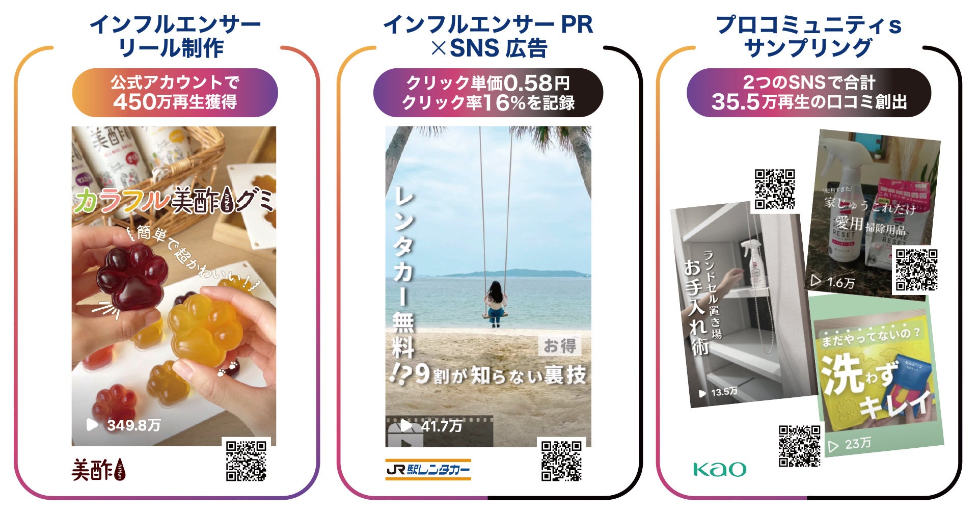 本サービスは、Instagram及びTikTokを軸としたSNSユーザーによる、SNSや口コミサイトでの販促効果の高い良質な口コミ生成をはじめ、影響力の高いインフルエンサーが持つノウハウを活かした縦型ショート動画などのコンテンツ制作などが可能です。また、PRはもちろん、数百人規模のサンプリング、写真撮影・動画制作、SNS・WEB広告活用、店頭POP活用、連携ユーザーへのアンケート等さまざまな施策にも応用できるものです。
