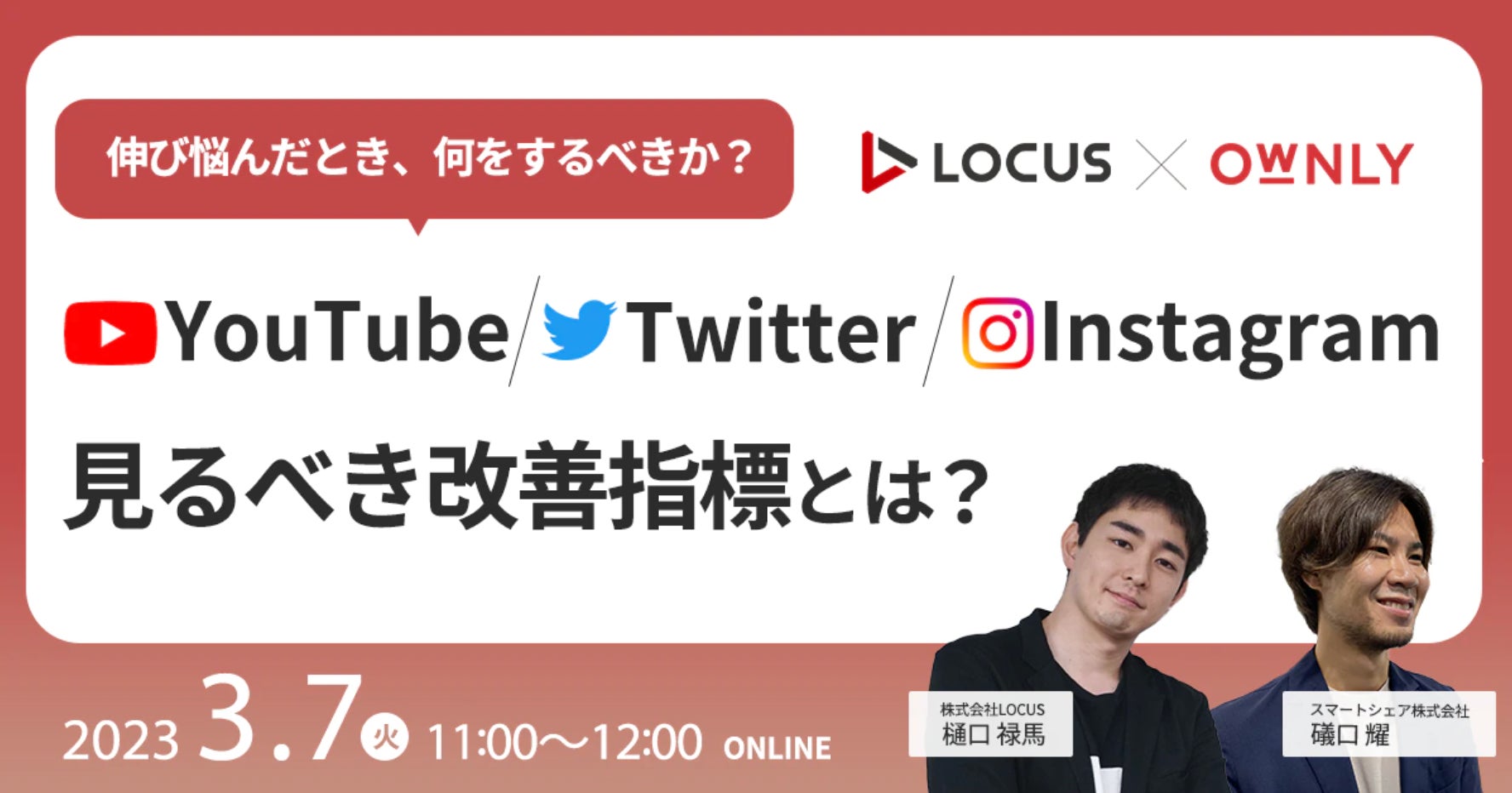 SNSマーケティングプラットフォーム「OWNLY」(オウンリー)を開発・運営するスマートシェア株式会社(東京都渋谷区、代表取締役 西山統)は、株式会社LOCUS(本社:東京都品川区、代表取締役 瀧 良太)と2023年3月7日(火)にオンラインセミナーを開催いたします。