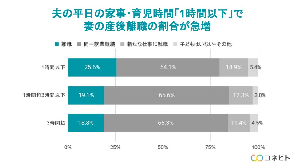 夫の家事・育児「平日1時間以下」で妻の4人に1人が産後離職。 ワークライフバランス実現は企業の人手不足解消にも効果あり