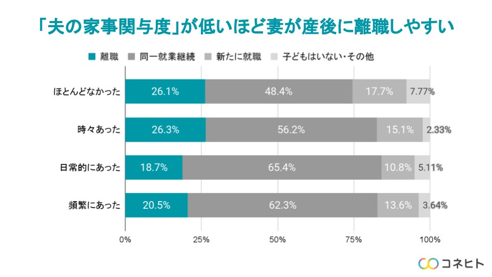家事関与度が「ほとんどなかった」場合、26.1%つまり4人に1人が産後離職したと回答。一方、家事関与度が「頻繁にあった」場合は産後離職した割合は20.5%。「ほとんどなかった」よりも6ポイント近く低下します。