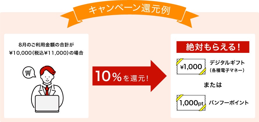 8月のご利用額の10%を、デジタルギフト(各種電子マネー)またはバンフーポイントに大還元!簡単なエントリーのみでご応募いただけます。