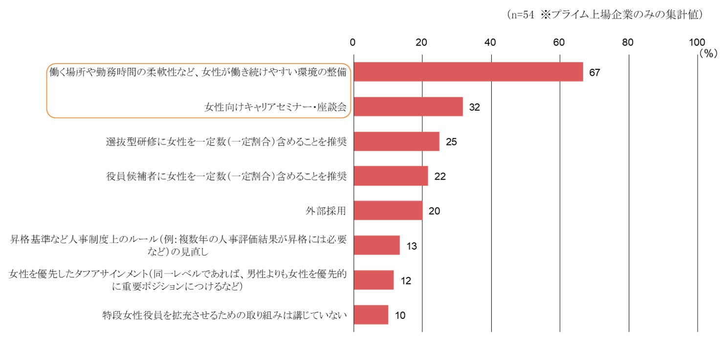 女性役員の選出・育成上の課題としては、昨年に引き続き、「女性管理職の絶対数の少なさ」(92%)、「役員就任へのモチベーション上の課題」(39%)の順に多い結果となりました。女性役員の拡充に向けた部長クラス(女性)への取り組みとしては、「働く場所や勤務時間の柔軟性などの環境整備」(67%)、「女性向けキャリアセミナー」(32%)の順に多く、役員候補に女性を一定数(割合)含めることやタフアサインメントの優先的な付与は、いずれも10%強にとどまりました。女性役員の拡充に向けては、「環境整備」や「意識付け」に関する取り組みが優先されていることがうかがえました【図表3】。