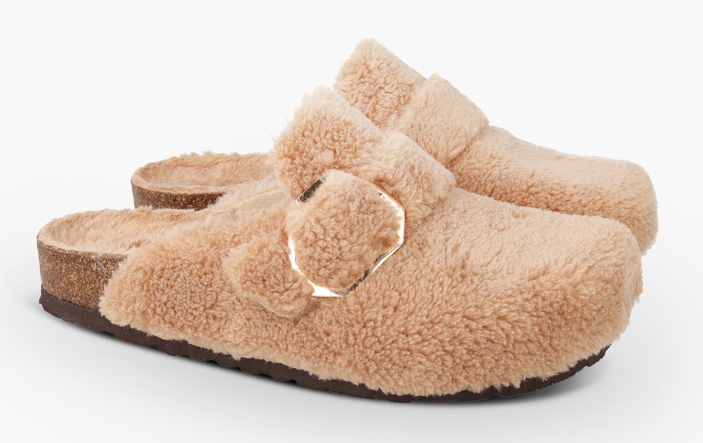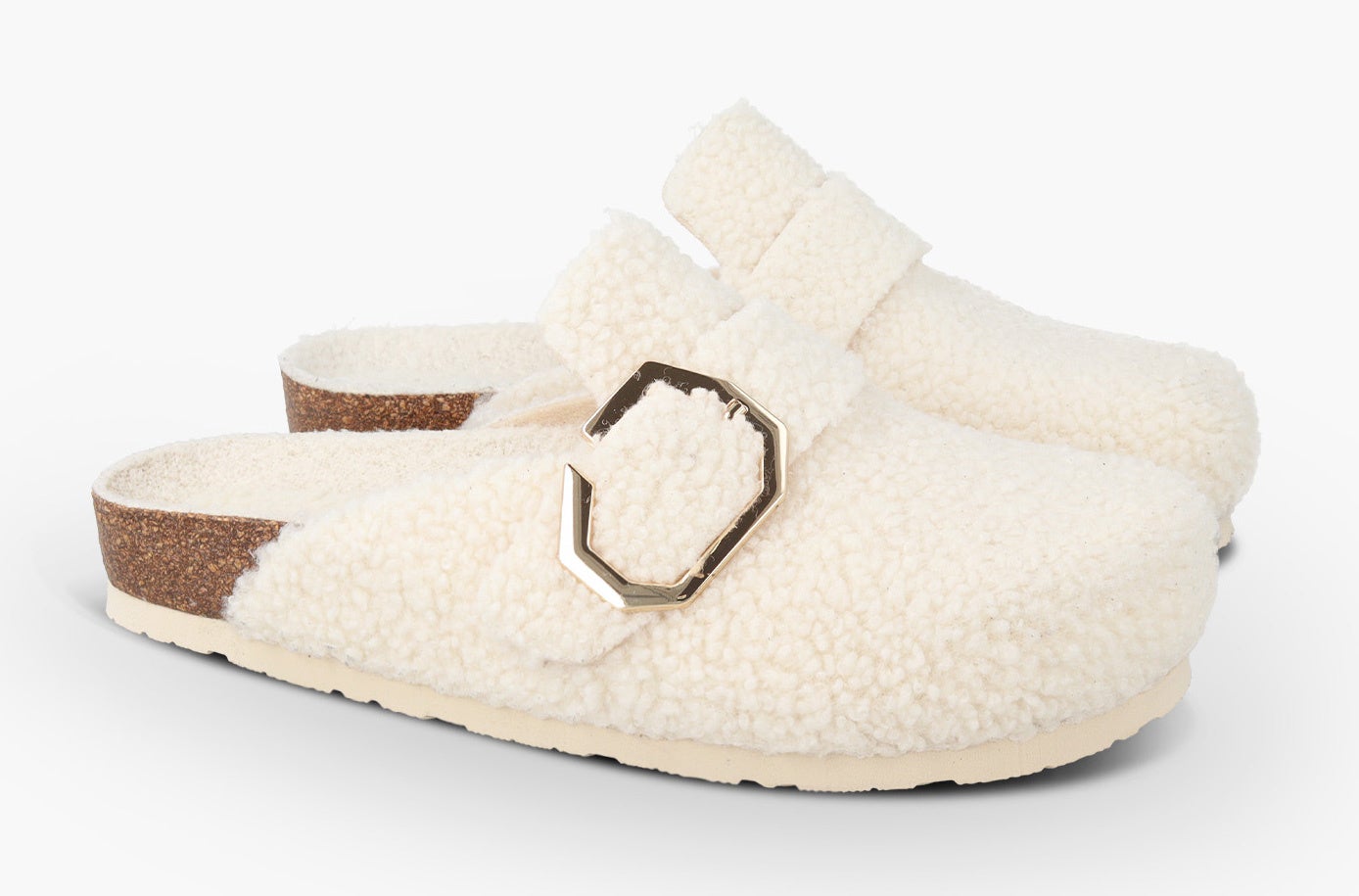 テディベアのようにふわふわとした風合いのヴィーガン仕様のボアをアッパーとフットベッドに配した新モデル。6角形のバックルがアクセントのベルトストラップでフィット感を調整可能です。天然コルクのミッドソールと人体構造に基づいて設計されたフォームのフットベッドが足への圧力を分散して安定性を高め、足の疲労を和らげて快適な歩行をサポートします。軽量EVAアウトソールで歩きやすさも抜群です。