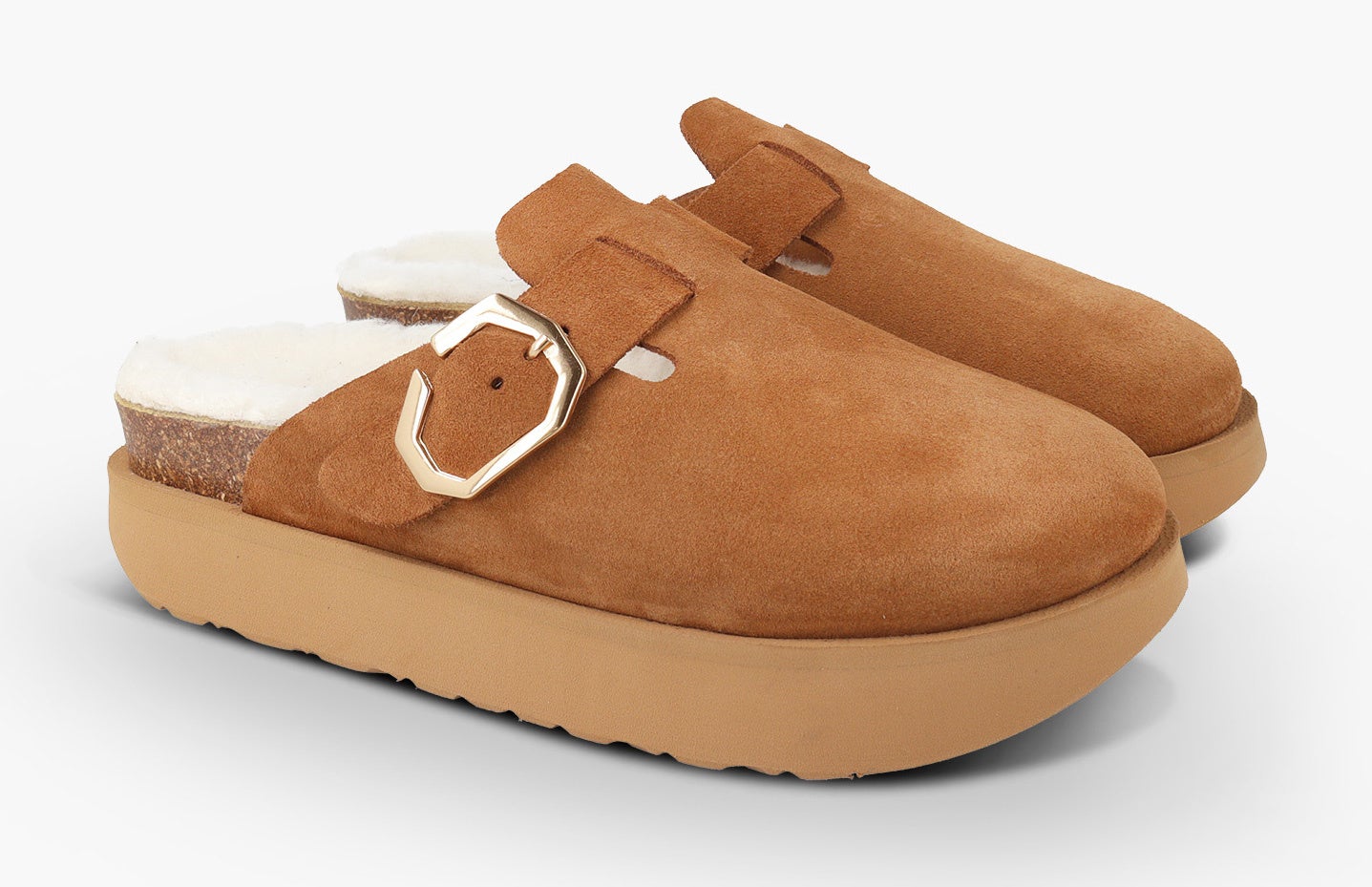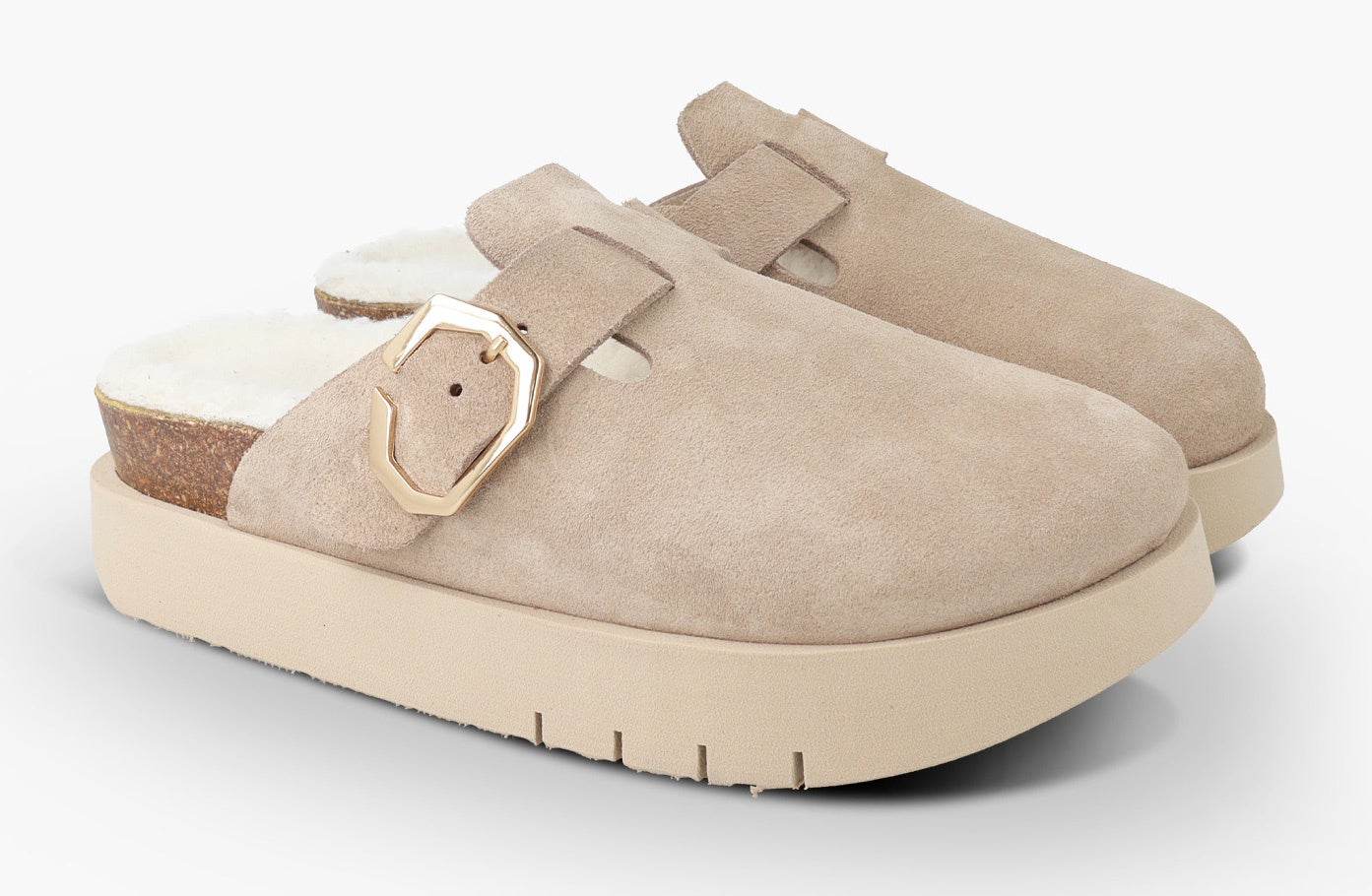 アッパーにLWG(※)ゴールド認定の高品質なスエード素材を使用した新モデルの厚底サンダル。フットベッドには天然ウールのボア素材を配し、暖かくソフトな履き心地です。天然コルクのミッドソールと人体構造に基づいて設計されたフォームのフットベッドが足への圧力を分散し、足をサポート。安定性を向上させ、快適な歩行を実現します。ベルトストラップでフィット感を調整でき、高さ2.6cmのEVAアウトソールでスタイルアップも叶います。