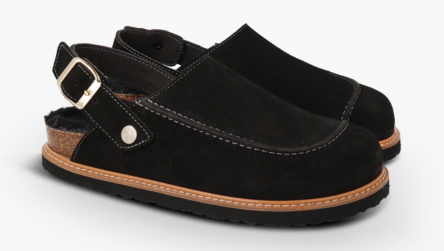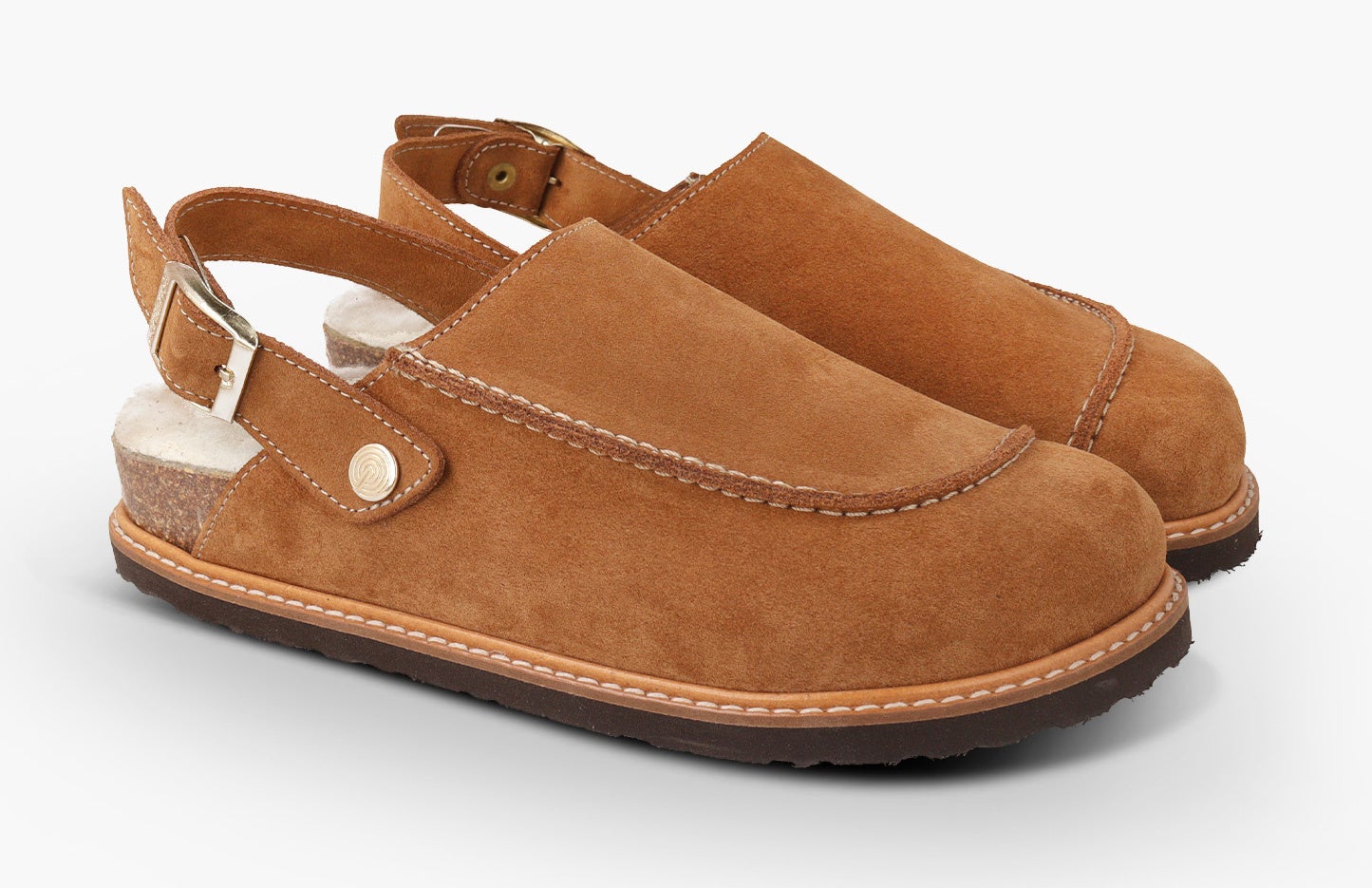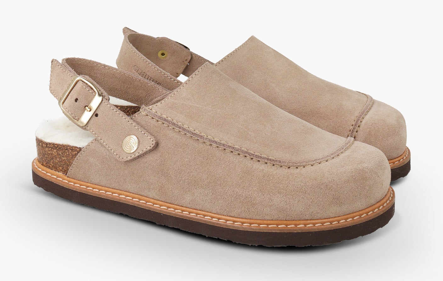 暖かみのあるベロアレザー(起毛革)をアッパーに採用した新モデル。6角形のビッグバックルのベルトストラップでフィット感を調整可能。フットベッドには天然ウールのボア素材を配し、暖かくソフトな履き心地です。天然コルクのミッドソールと人体構造に基づいて設計されたフォームのフットベッドが足への圧力を分散して安定性を高め、足の疲労を和らげて快適な歩行をサポートします。アウトソールは軽量EVA。
