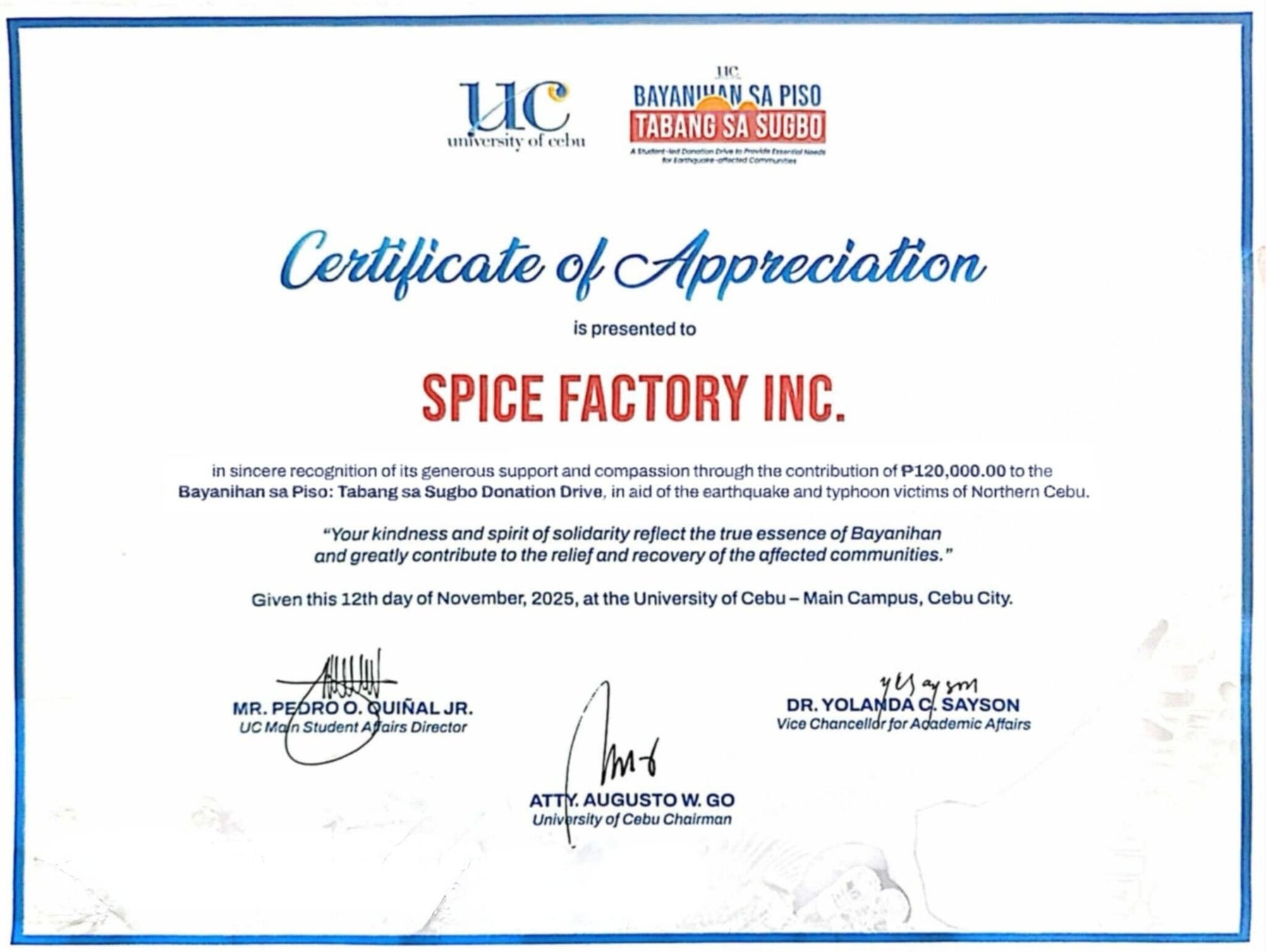 デジタル・トランスフォーメーションを⽀援するスパイスファクトリー株式会社(本社:東京都港区、代表取締役CEO:高木 広之介)は、フィリピン・セブ島北部で発生した地震および中央部を襲った大型台風の被災地復興支援のため、セブ大学の支援受付窓口へ寄付を行いました。