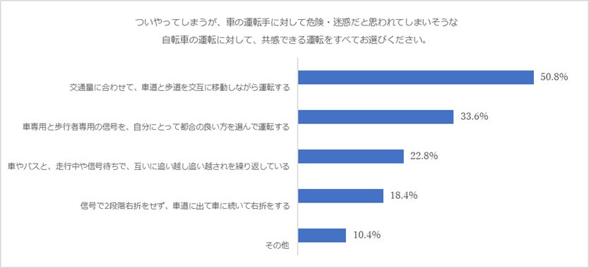 「車に危険・迷惑だと思われるのに、ついやってしまう運転」に対して共感できるものとして、「交通量に合わせて車道と歩道を交互に移動しながらの運転」が過半数を超える結果となりました。