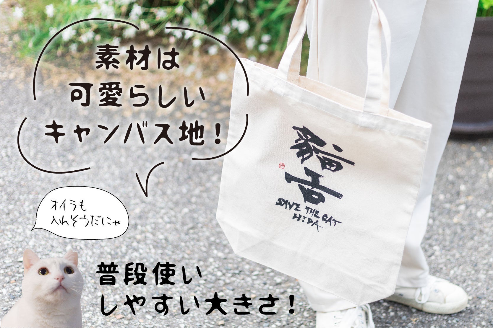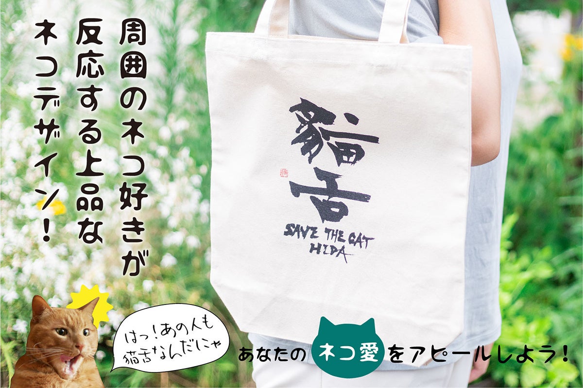 時の首相が掲げた、あの「令和」の文字を書いた飛騨市出身の書家・茂住菁邨(もずみせいそん)氏による、アートのように美しいトートバッグ。よく見ると猫好きの心をくすぐるというギャップがたまりません。