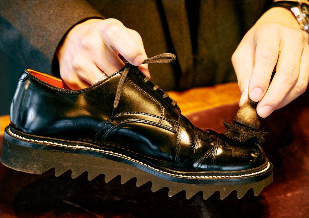 修理の必要のない状態の良いシューズまた修理後のシューズにメンテナンスを施します。汚れを落とし、クリームで栄養分を補給しながら磨き上げた後、除菌加工します。
