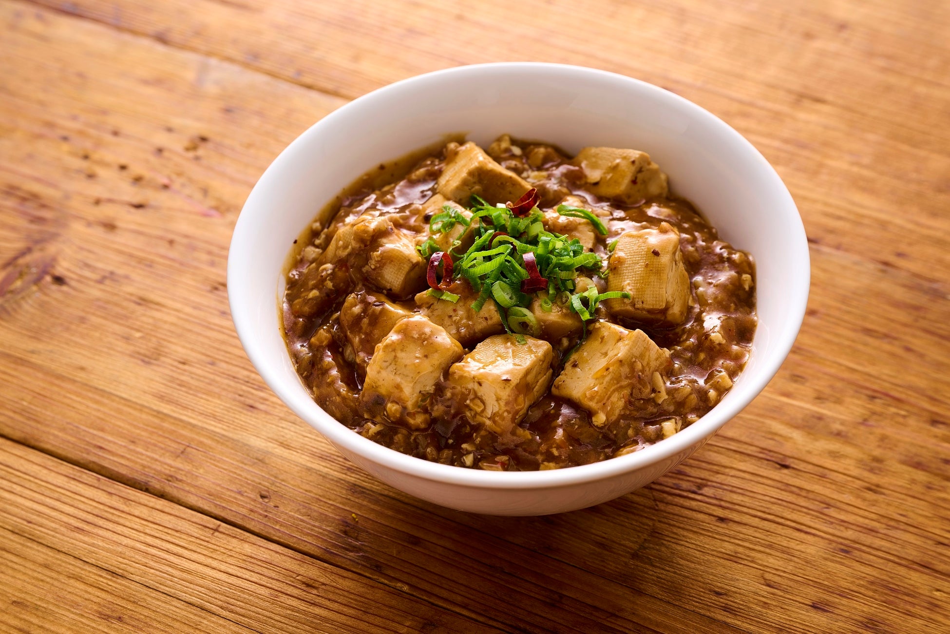油で香味野菜、豆板醤、甜面醤を炒めることで、辛みは適度に、うまみは最大限に引き出しています。またチルドの豆腐を使用し、豆腐本来のおいしさが味わえます。味作りのポイントは、特製のソースがしっかりと豆腐に染み込むよう、豆腐を投入後に“煮込む”というひと手間を加えています。