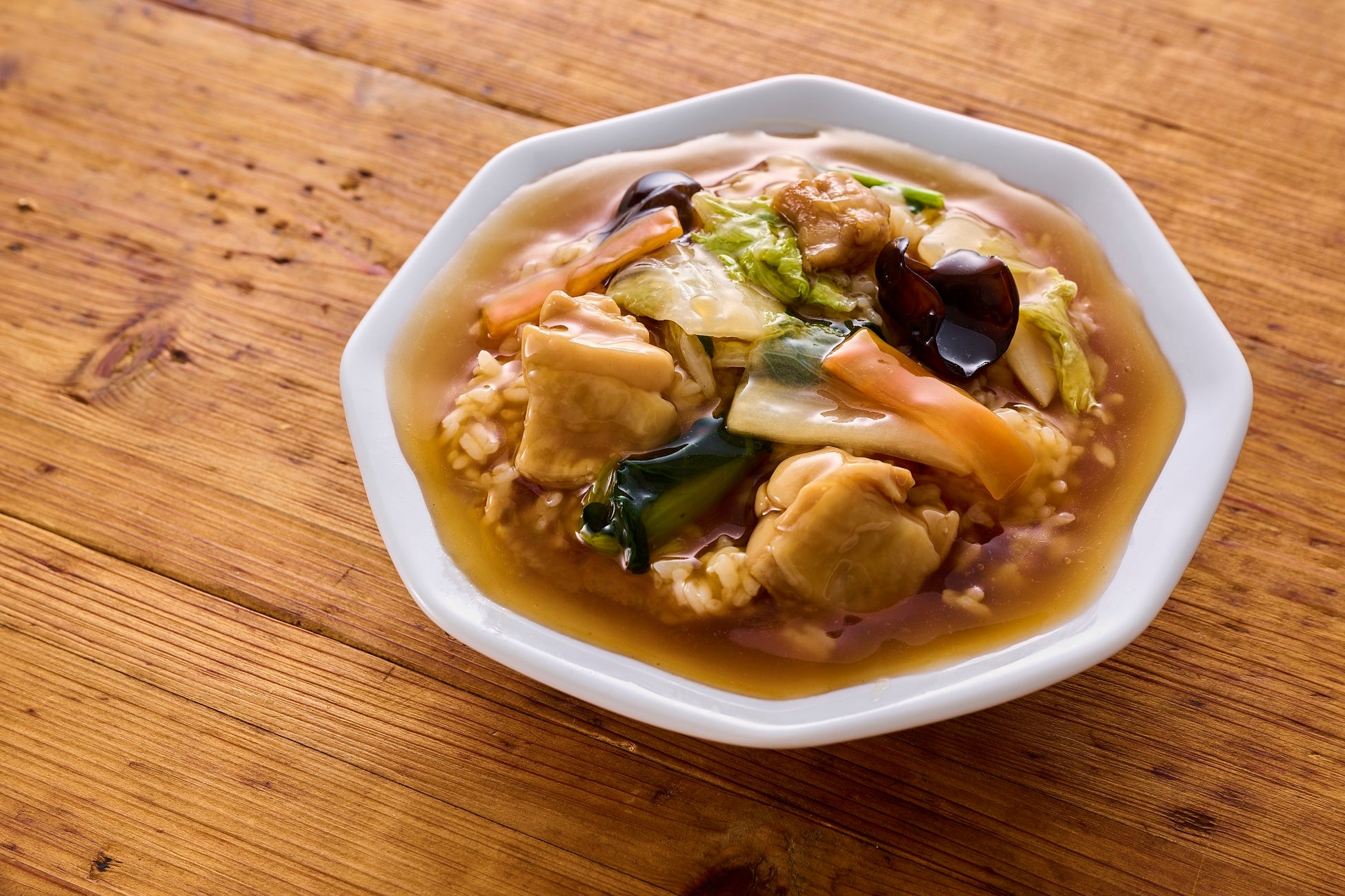 人参、白菜、椎茸、きくらげ、小松菜、鶏肉の6種類の具材を使用。あんは鶏ガラスープをベースに醤油、オイスターソースなどの調味料を加え、コク深い仕立てです。こだわりポイントは隠し味に乾燥椎茸を水戻しし、出てきたうまみを加え風味豊かな味わいに仕上げました。