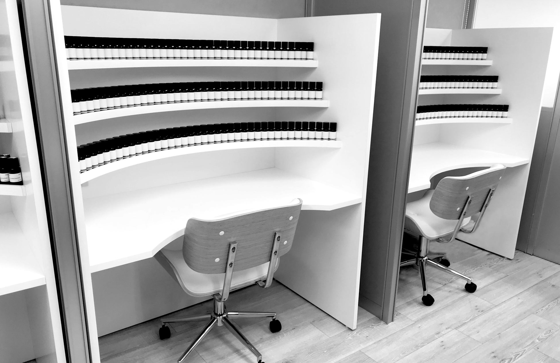 フルオーダーメイドの高級フレグランス製作サービスを開始するにあたり、当社は文京区本社内に、お客様と一緒に創るフレグランスサロンをオープンしました。このサロンは、自分だけのフレグランスを創りたいとお考えのお客様が、ゆったりとくつろぎながら当社調香師と一緒に、世界で唯一の香りを生み出せるようデザインしたサロンとなっています。当サロンの最大の特徴である4台のオルガン型調香台は20世紀以前のフランスの調香台を彷彿とさせ、革新的なモダンさも取り入れた未来志向のフレグランスサロンとなっています。
