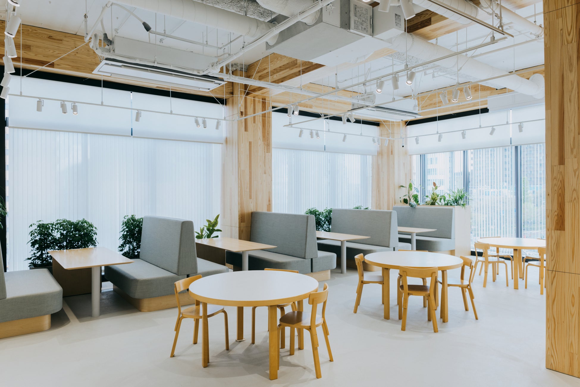 ファミレスをイメージした対面型のソファ席や丸テーブル、座り心地の良い大きなソファなどを配置したスペース。打ち合わせや雑談、気分転換しながらの作業など、さまざまなコミュニケーションの場として活用されています。