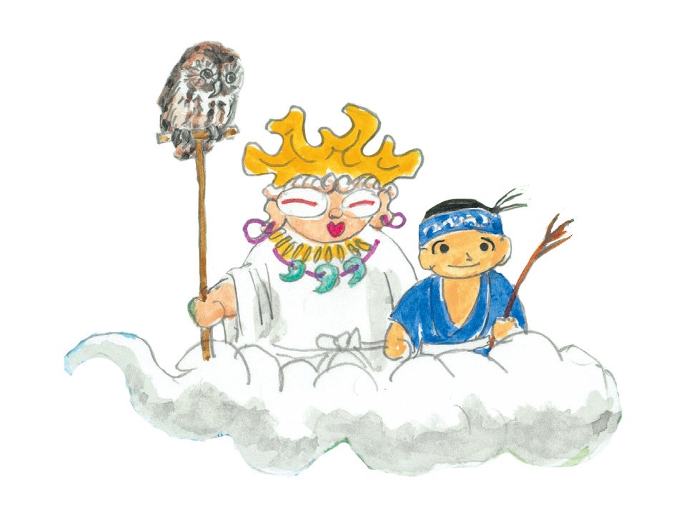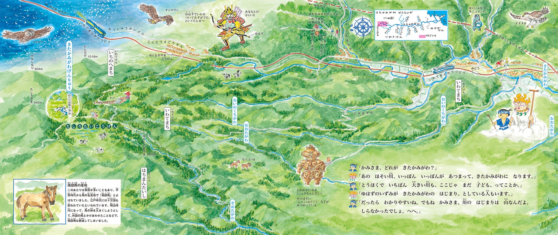 本作の案内人は、土偶の神さまと、北上川のはじまりの場所、七時雨山のあたりに住む男の子です。ふたりは雲に乗って、上から川をたどっていきます。