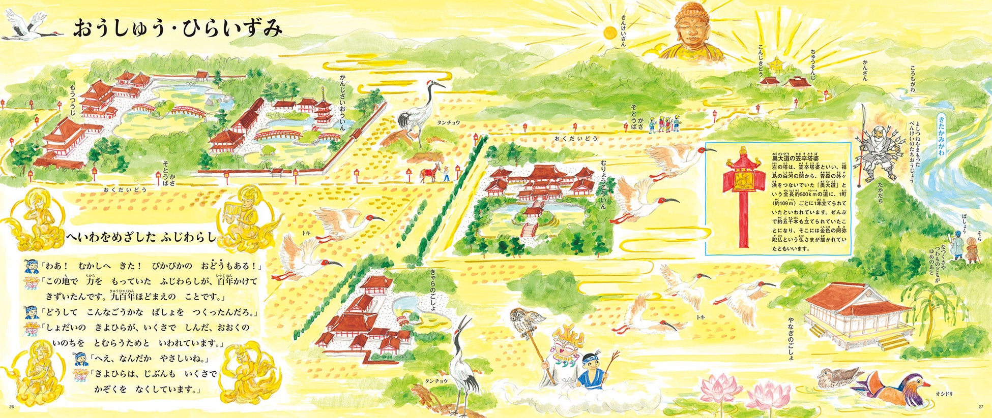 途中、奥州・平泉では、ふたりが昔へひとっとびし、900年前の中尊寺周辺を案内してくれます。
