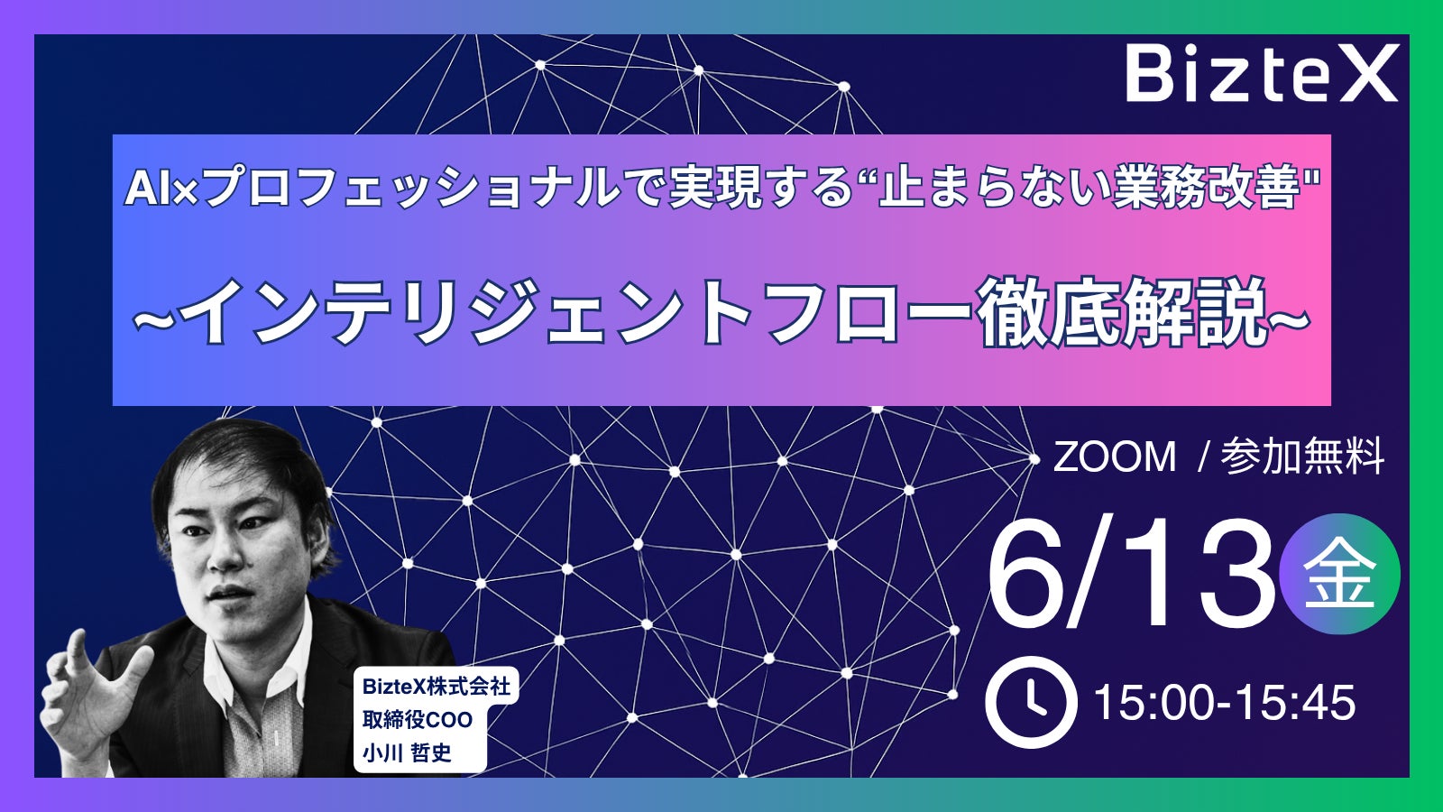 2025年6月13日(金)15:00より、「AI×プロフェッショナルで実現する“止まらない業務改善”~インテリジェント フロー徹底解説~」と題したセミナーをオンラインにて開催します。