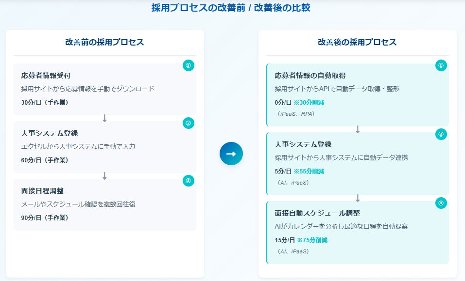 某社では、人事担当者が採用候補者の応募情報を手作業で処理していたため、採用活動が活発な時期には残業が常態化していました。しかし、「インテリジェント フロー」を導入したことで、採用プロセスの自動化が進み、残業時間を大幅に削減できました。さらに、AIと人のリソースを組み合わせた柔軟なプロセス設計により、例外的なケースにも迅速に対応できる仕組みが整っています。